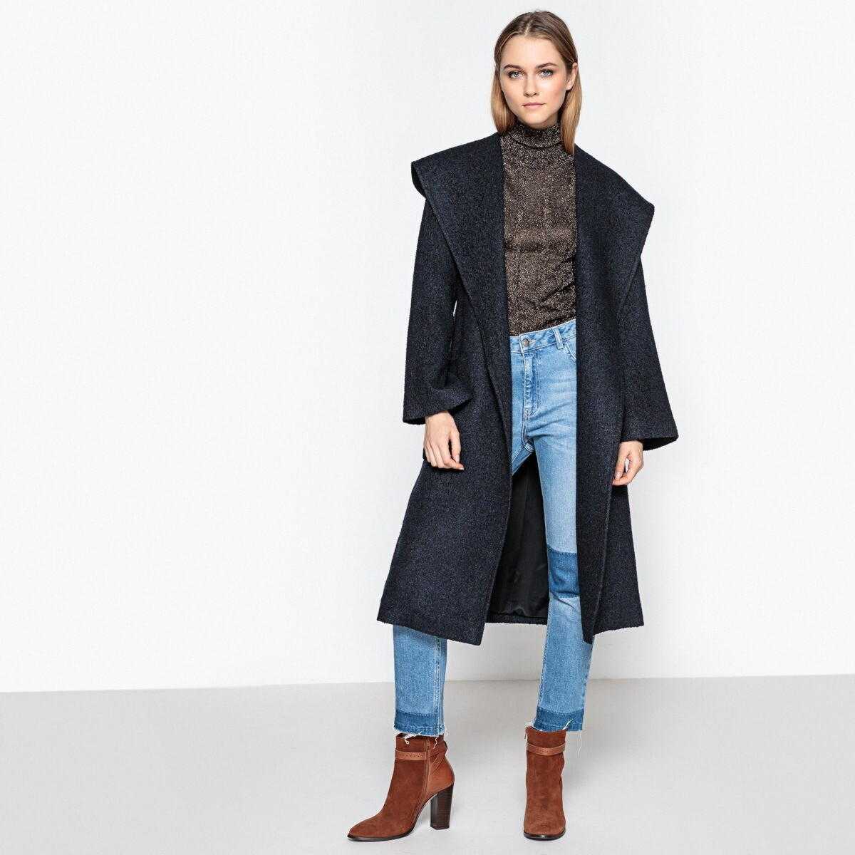 - Пальто-халат. У модели нет пуговиц, но есть пояс. Воротник здесь или объёмный, или фигурный, а у некоторых вариантов его нет вовсе. Модель называется халатом, поскольку она весьма его напоминает.