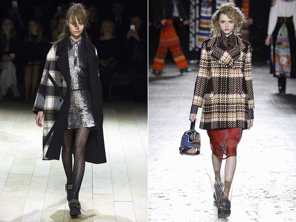 Клетка. Казалось бы, что можно придумать с этим привычным рисунком. Оказалось можно. Толщина линий варьируется от совсем тонкой до впечатляюще толстой даже в одной модели пальто. Кроме этого разные ячейки клеток окрашены в яркие цвета — зеленый, синий и белый. Как такая модель может оказаться незамеченной на улице? Даже стандартная английская клетка в новых коллекциях смотрится по-новому благодаря отделке всех краев пальто тесьмой оранжевого цвета.