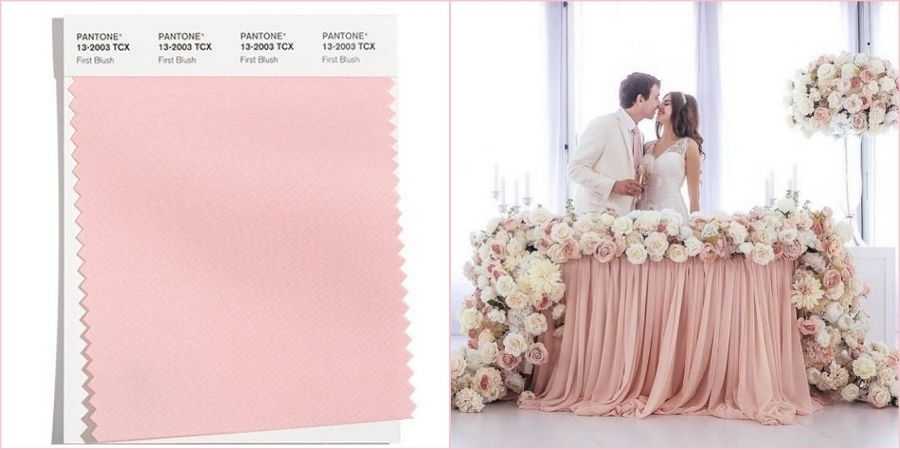 Нежный, мягкий оттенок розового, словно легкий румянец после мороза – замечательный выбор для классической осенней и зимней свадьбы. Если сравнивать «First Blush» с остальными модными цветами, то он больше всех ассоциируется со свадебным торжеством. Ведь в нежно-розовом можно подобрать и букетик невесте, и оформить банкетный зал, и сервировать праздничный стол, и даже подвенечное платье.