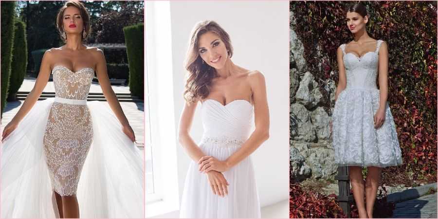 Короткий свадебный наряд в виде трапеции отлично преподнесёт красивый бюст, уменьшит талию, отвлечёт внимание от лишних килограммов на попе. Подходящие модели свадебных платьев для полных девушек — на фото ниже: