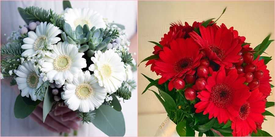 - Для зимней свадьбы лучше выбрать морозостойкие растения — герберы, розы, гвоздики, каллы, тюльпаны, хризантемы. Для лета или осени подойдут сочетания из лилий, ромашек, георгинов.