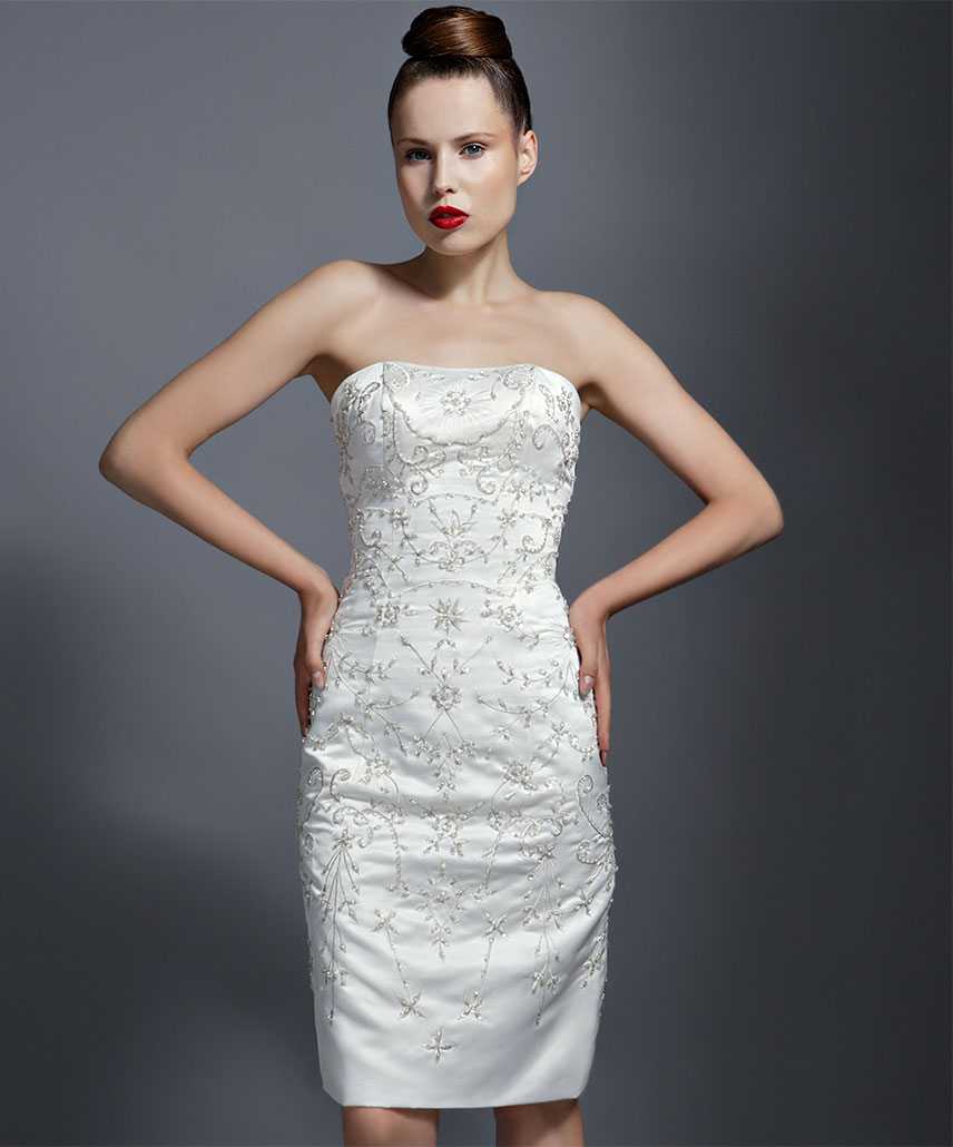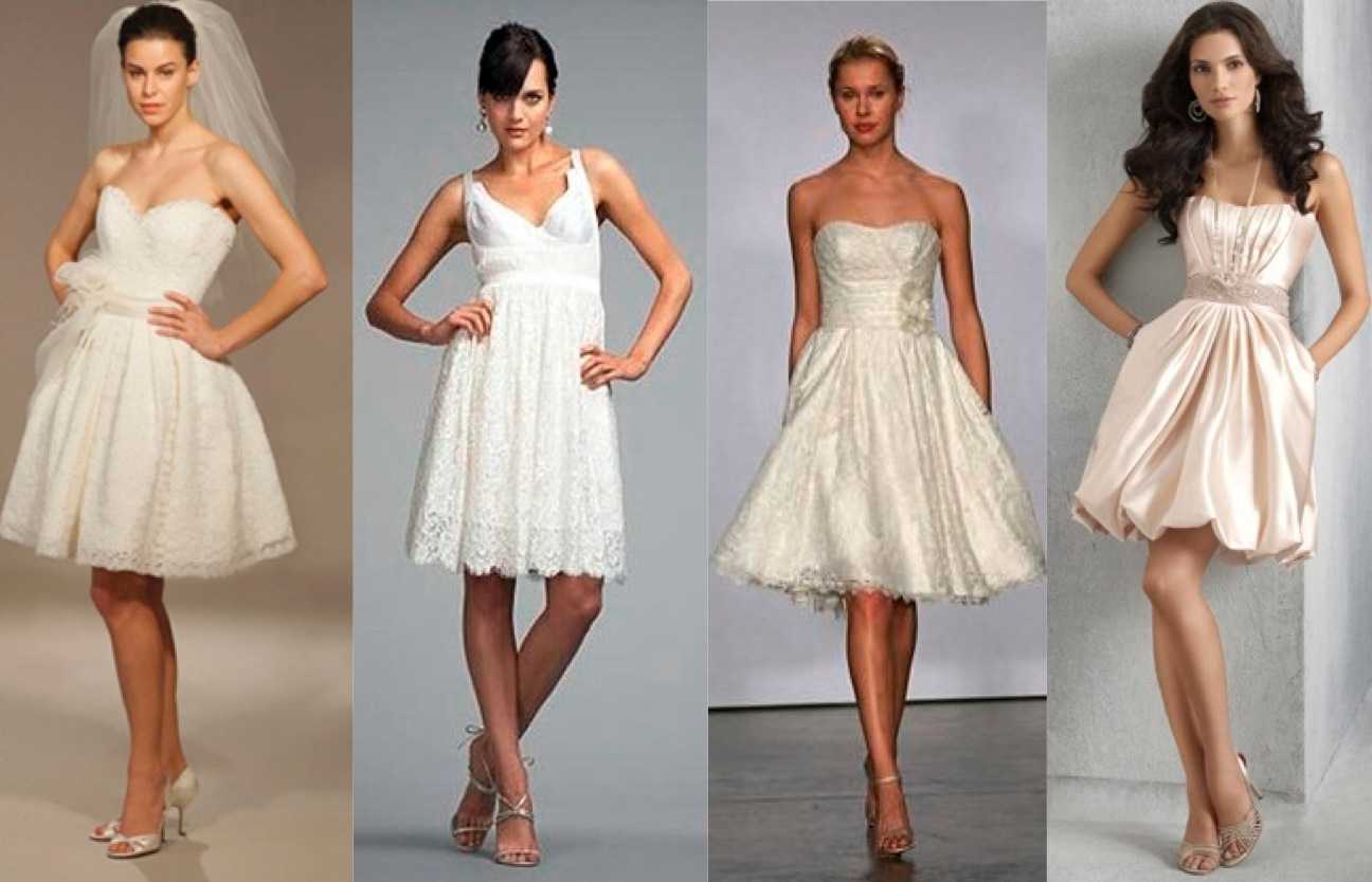 Существуют самые разнообразные модели коротких свадебных платьев. Пальма первенства по-прежнему принадлежит классическому платью-футляру, одинаково хорошо смотрящемуся на хрупких и на пухленьких барышнях. Изделия украшают кружевом, пайетками, бисером и стразами.