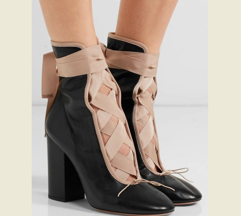Высокая шнуровка в предложенной дизайнерами обуви выполняет декоративную функцию. Этот элемент встречается на полусапожках и ботильонах от Tod’s, Giorgio Armani, Hermès, Trussardi. Вместо традиционных шнурков используют атласные ленты, декоративную тесьму в тон или контрастную. Подобная деталь создает визуальную вертикаль. Такой прием выгодно вытягивает силуэт, делает ноги стройнее и длиннее.