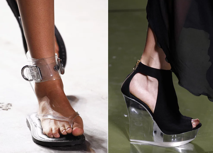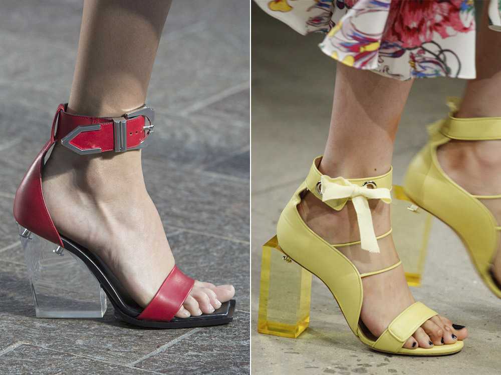 Новинками в мире обувной моды весной 2019 года стали прозрачные каблуки, которые можно выделить в отдельный тренд. Разнообразие вариантов поражает воображение. Дизайнеры предлагают классические шпильки, танкетки сложной геометрии, расширяющиеся каблуки.
