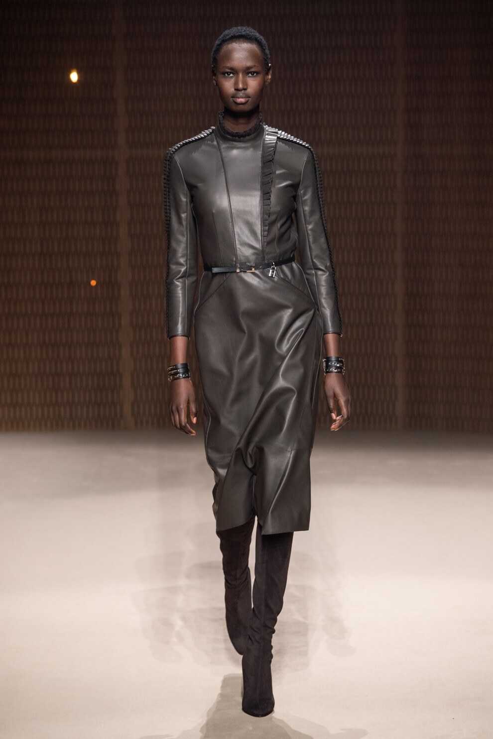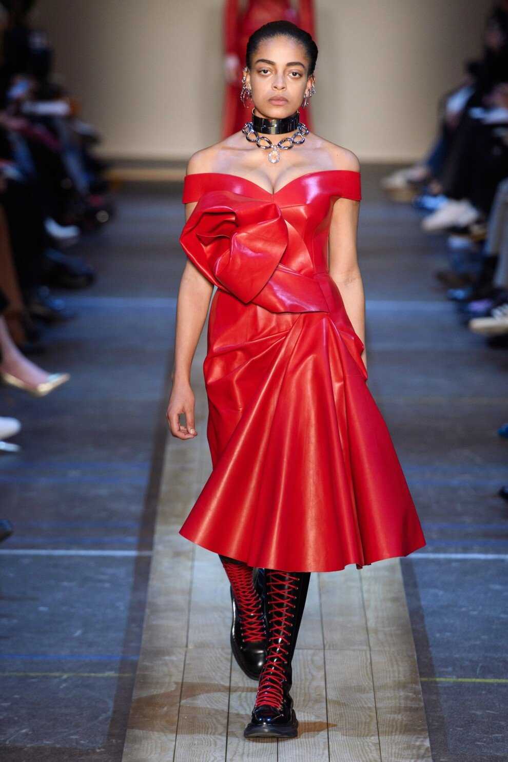 Кожа считается универсальным материалом с особым характером. В этих сезонах очень модно использовать данный материал для пошива платьев. И эффект просто сногсшибательный. Такое изделие утонченно облегает тело и совершенно не требует излишних дополнений. Лучше всего из кожи получаются платья-футляры либо модели с обтягивающей верхней частью и пышной юбочкой. Однако просторные модели смотрятся не менее стильно и привлекательно. Такие варианты должны слегка намекать на изгиб фигуры, а не полностью демонстрировать ее. Отличный фасон нам демонстрирует платье от Poustovit — объемное изделие с длиной ниже колен с достаточно объемными и пышными рукавами. На подоле платья выполнены привлекательные и соблазнительные вертикальные складочки. Платья, изготовленные из данного материала, очень подходят для холодных сезонов 2019-2020 года, ведь кожа очень плотная, хорошо согревает и не пропускает ветер. Касаемо цветового решения, то лучше всего выбирать кожаные платья серого, коричневого или красного цвета.