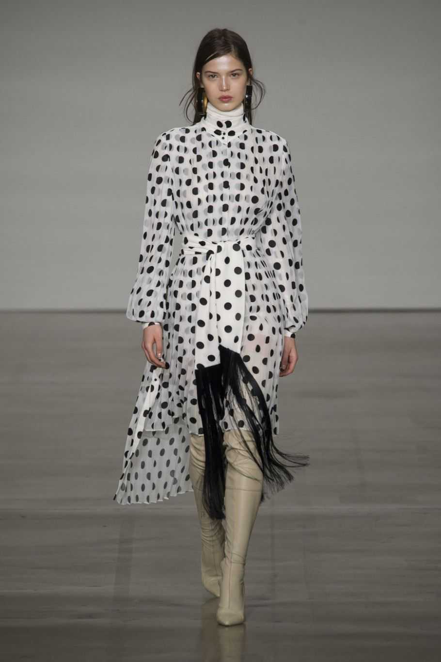 Немного драматизма добавят роскошные накидки, модные приближающейся осенью и зимой. Просторное чёрное платье в белую точку, похожее на звёздное небо, украшает величественно развевающаяся позади накидка, похожа на мантию. Такой вариант представили нам в Noon by Noor.