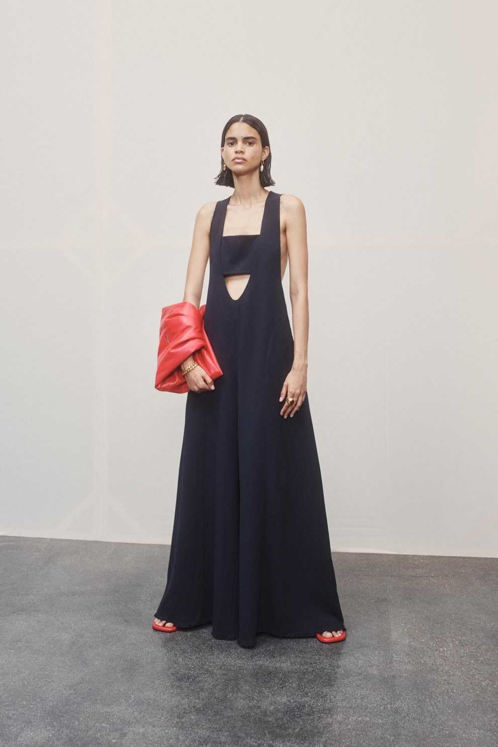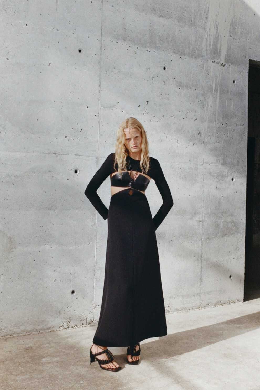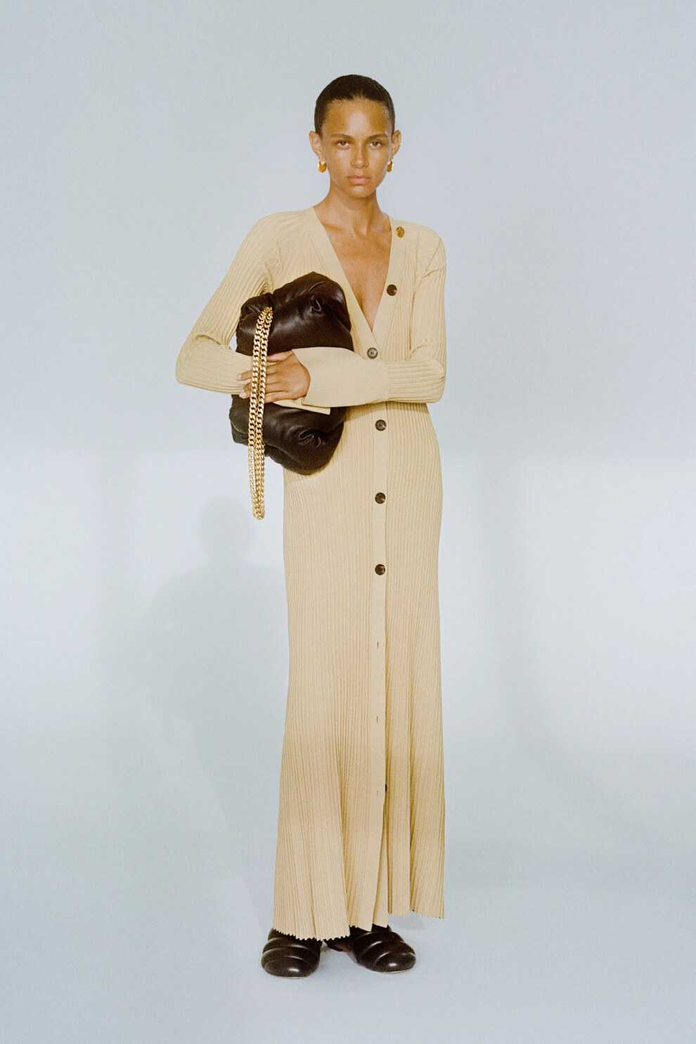 Идеальные аксессуары к такому платью поддерживают нейтралитет: черная матовая кожа, бежевые и прозрачные детали завершают образ и ставят платье в центре внимания.