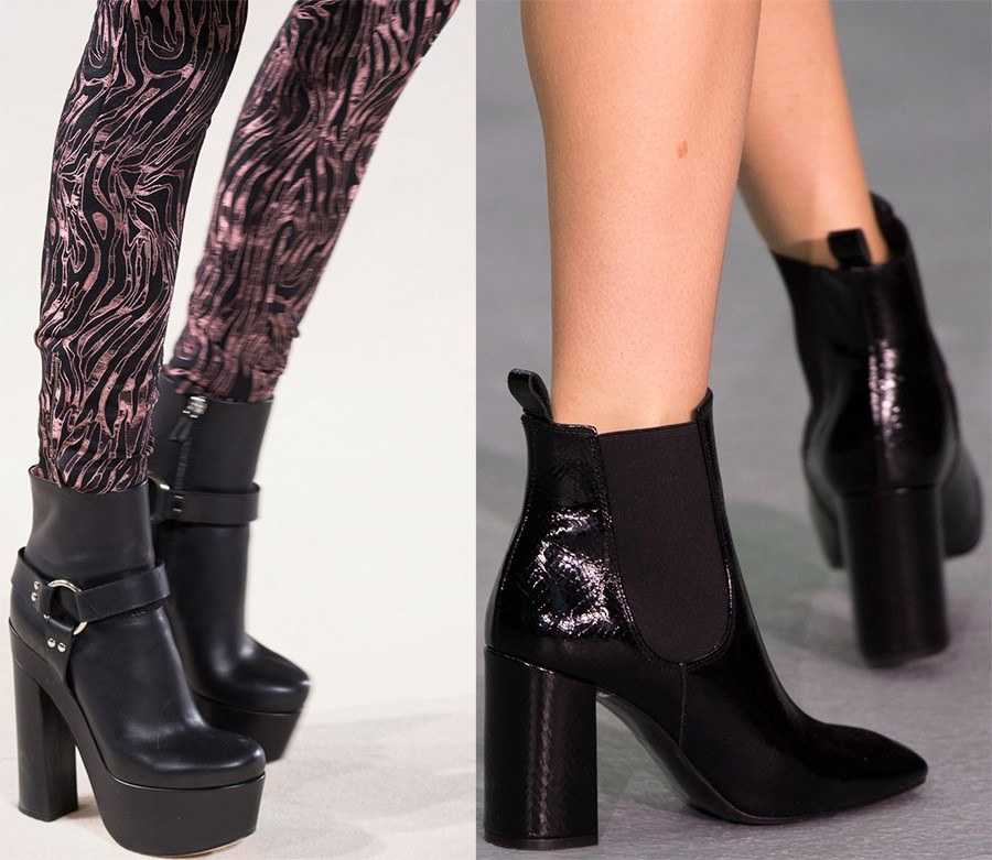 Стилисты отдают предпочтение далеким друг от друга вещам. Сочетание острого носа с массивным каблуком и тракторной подошвой становятся настоящим хитом будущих сезонов. Также популярными становятся эпатажные модели сапог. С клиновидной или круглой формой каблука. Но чаще всего такие изделия предназначены для выхода в свет, в качестве ежедневной носки они не подходят.