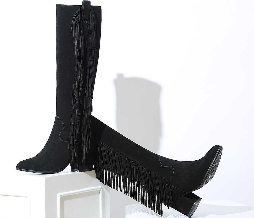 Идеальное сочетание моделей из замши происходит с вечерним образом. Подчеркивается ваша женственность и изысканность. Сапоги из замши не рекомендуется носить в сырую погоду, они быстро пропускают влагу и поддаются деформации. В качестве украшения служат крупные стразы, не исключены геометрические узоры и принты.