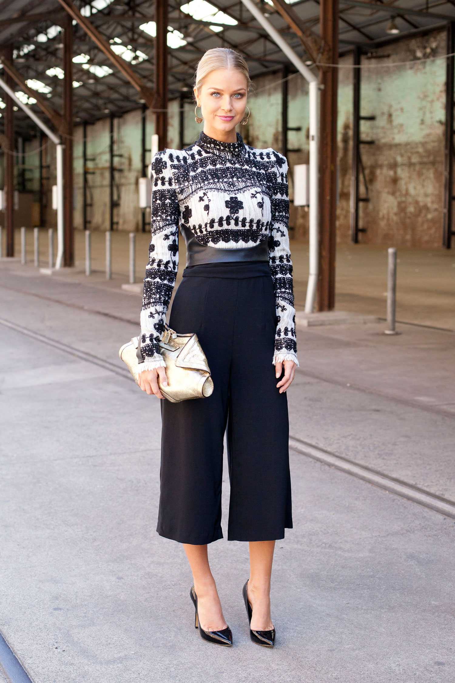 На торжества также можете носить черные брюки с завышенной талией. Лучше дополнить их корсетом или бюстье из кожи. Этот эффектный наряд сделает вас звездой вечера. Из обуви можно взять лодочки или изящные босоножки на каблуке. Чтобы завершить образ, возьмите клатч и тонкую подвеску на шею.