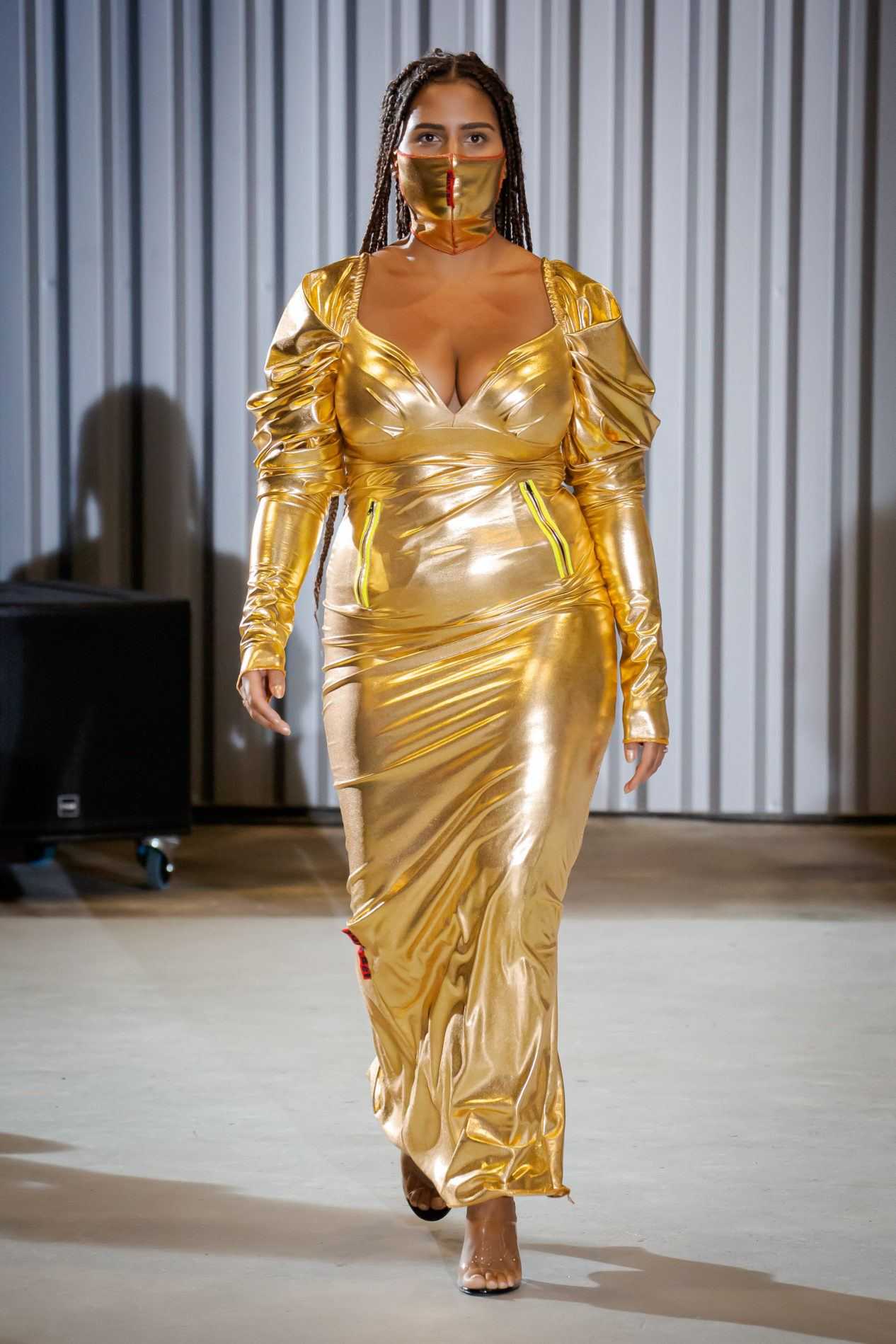 Платье, расшитое золотыми паетками, из коллекции Julien Macdonald