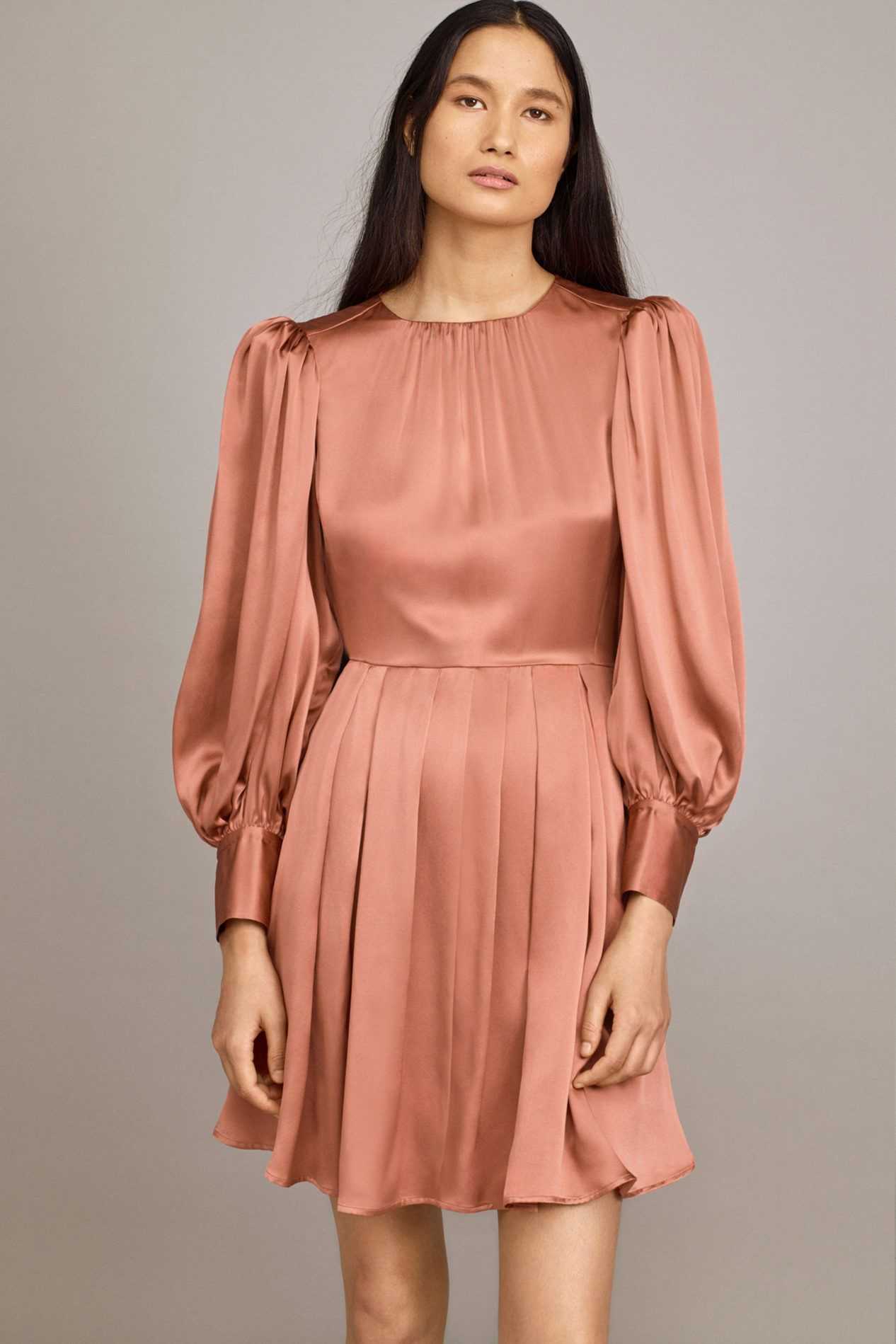 В каком платье встречать Новый год, если не любишь пайетки и яркие цвета? Например, в этом. Благородный коричневый цвет, модный асимметричный крой, блестящая ткань – то, что нужно для вечеринки! Завершите его длинными серьгами и акцентным аксессуаром для волос (это может быть повязка на голову, украшенная камнями или стразами, блестящие заколки для волос или узорчатая повязка на голову). Дополните наряд лаконичным атласным или бархатным клатчем, симпатичными серебряными туфлями и макияжем с акцентом на глаза – новогодний бант готов!