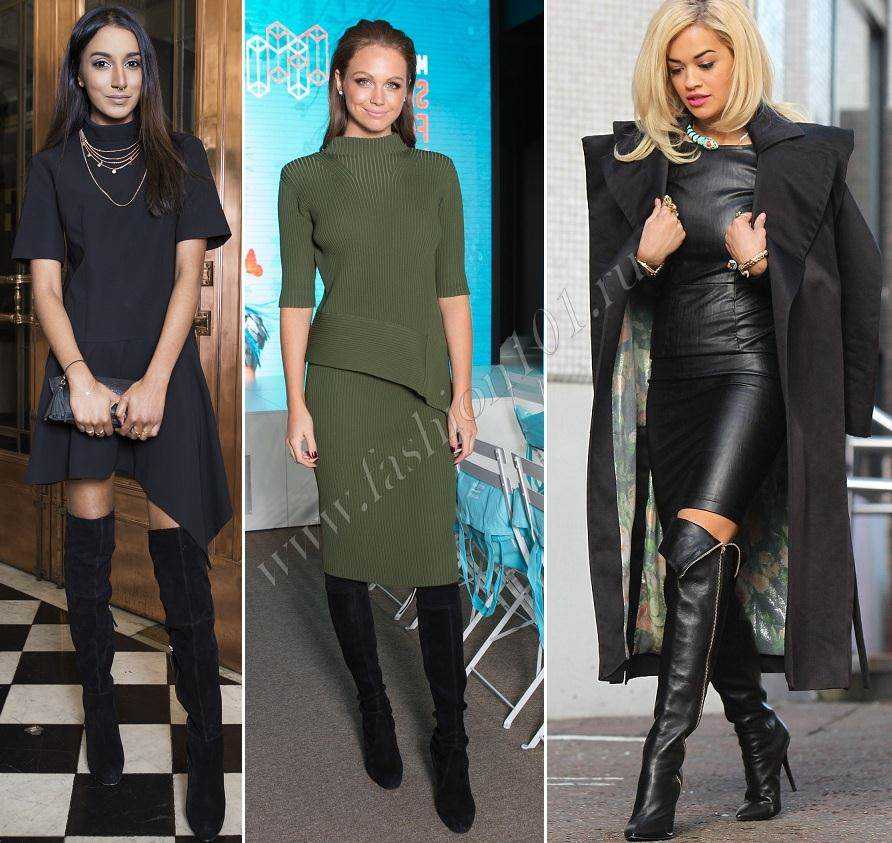 Но важно соблюдать главные правила гармонии. С ботфортами на высокой шпильке идеальны платья