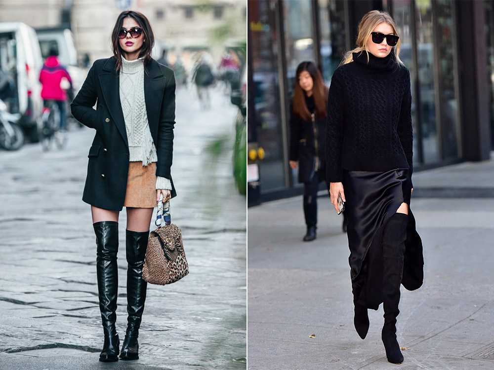 Похожий эффект получится, если собрать total black look с юбкой и водолазкой, дополнив комбинацию ботфортами. Образ идеален для свидания в парке, встречи с подружками или шопинга, если надеть сапоги на низком ходу.