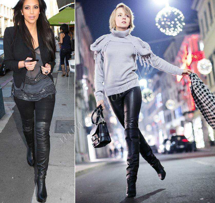 Кожаные ботфорты на каблуке отлично сочетаются с леггинсами из кожи. Берите пример с шикарной Ким Кардашьян.
