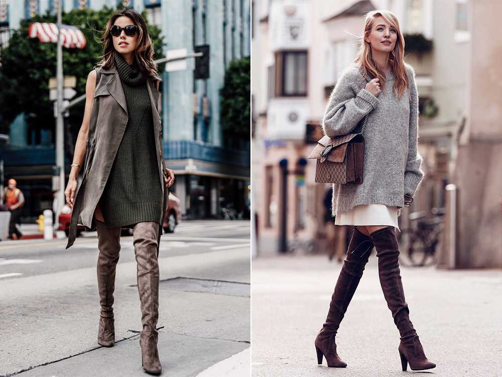 Удлиненный свитер или кардиган будет смотреться с ботфортами на каблуках не хуже платья. К свитеру лучше надеть темные леггинсы или плотные колготки в тон сапог, если позволяет длина верха. Джинсы и ботфорты на высоком каблуке – не лучший вариант, но и такое сочетание возможно.
