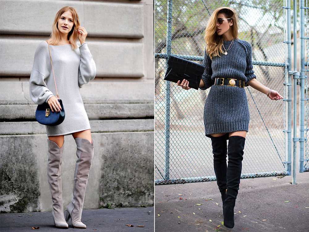Главное соблюдать общее правило: чем объемнее верх, тем более обтягивающим должен быть низ, и наоборот. То есть со свитером оверсайз нужно носить ботфорты, которые плотно облегают ноги, а с узким платьем хорошо смотрятся сапоги со свободными голенищами.