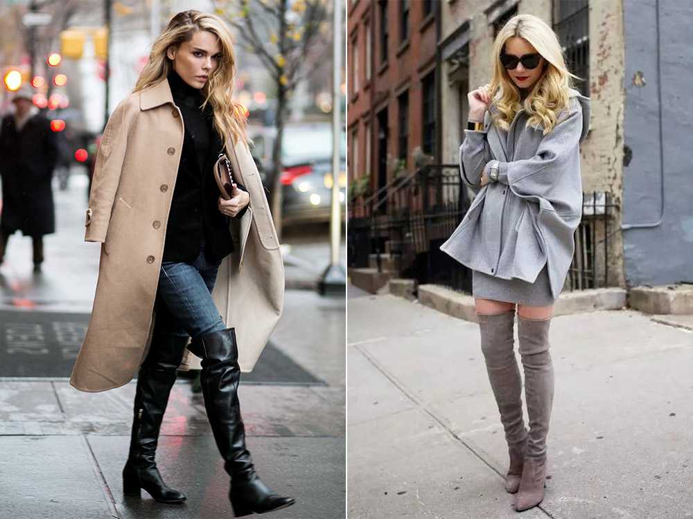 подходят кейпы, тренчи, приталенные или свободного кроя пальто, шубы и полушубки из пушистого и гладкого меха. Замшевые ботфорты
