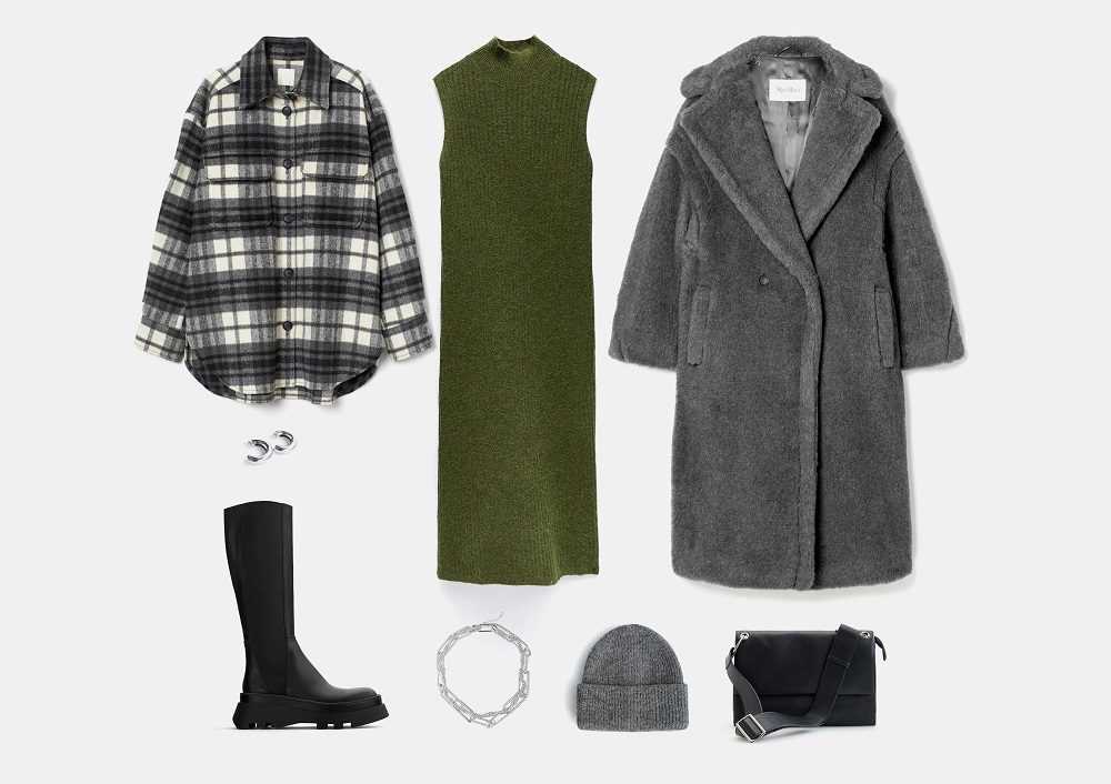 За основу возьмем трикотажное платье без рукавов длины миди. Оно может стать отличной базой для различных сочетаний. В данном случае предлагаем дополнить его тёплой рубашкой в клетку в черно-белой гамме.