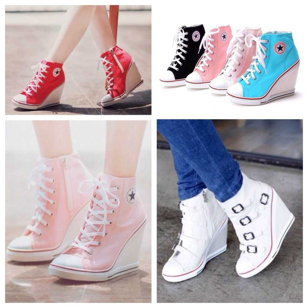 Современные девушки часто выбирают кроссовки на каблуках. Они сочетаются со спортивной одеждой, брюками, платьями. Могут быть разными: на шнуровке или липучках, с замком или резинкой. Объединяет их одно — танкетка с довольно высоким каблуком. Они очень идут стройным девушкам, которые хотят выглядеть выше, но предпочитают удобную обувь.