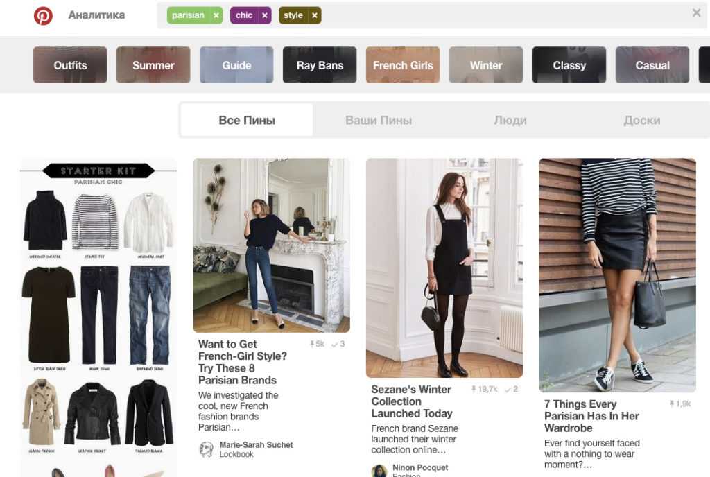 Как только вы приколете какую-то одну картинку, Pinterest предложит вам похожие, так что вы довольно быстро окажетесь в рамках того стиля, который вам по душе. Если вам нравится парижский стиль, о котором я пишу здесь, то можете начать с изучения моих досок – возможно, там есть образы которые соответствуют вашему мироощущению.