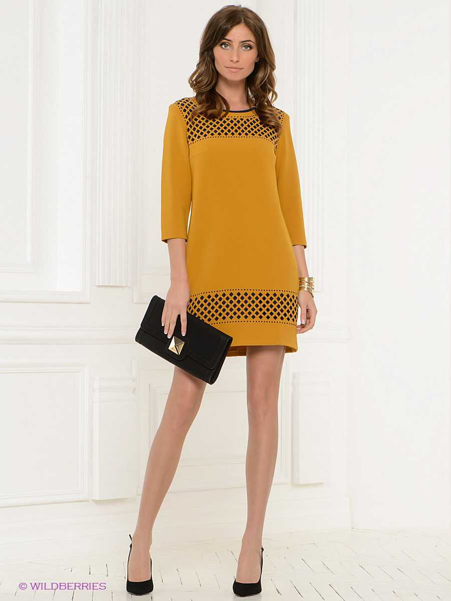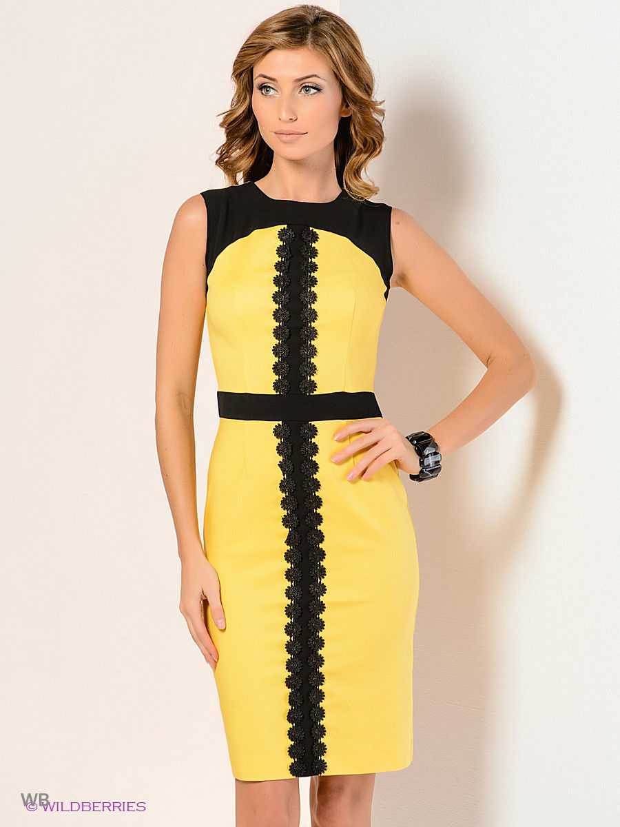 Классическое желтое платье-футляр встречается редко, поскольку для офиса оно считается слишком ярким. Сделать образ более сдержанным, в рамках делового дресс-кода, помогут дополнения базовых тонов: черный жакет, закрытые туфли, классическая сумка из натуральной кожи.