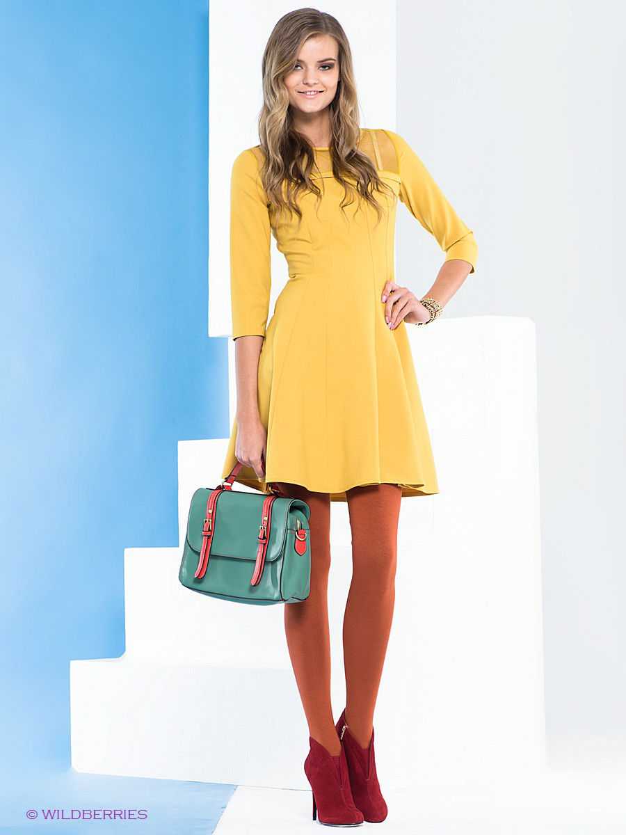 - с желтым платьем можно комбинировать одежду и обувь коричневого, зеленого, черного и бордового цвета;