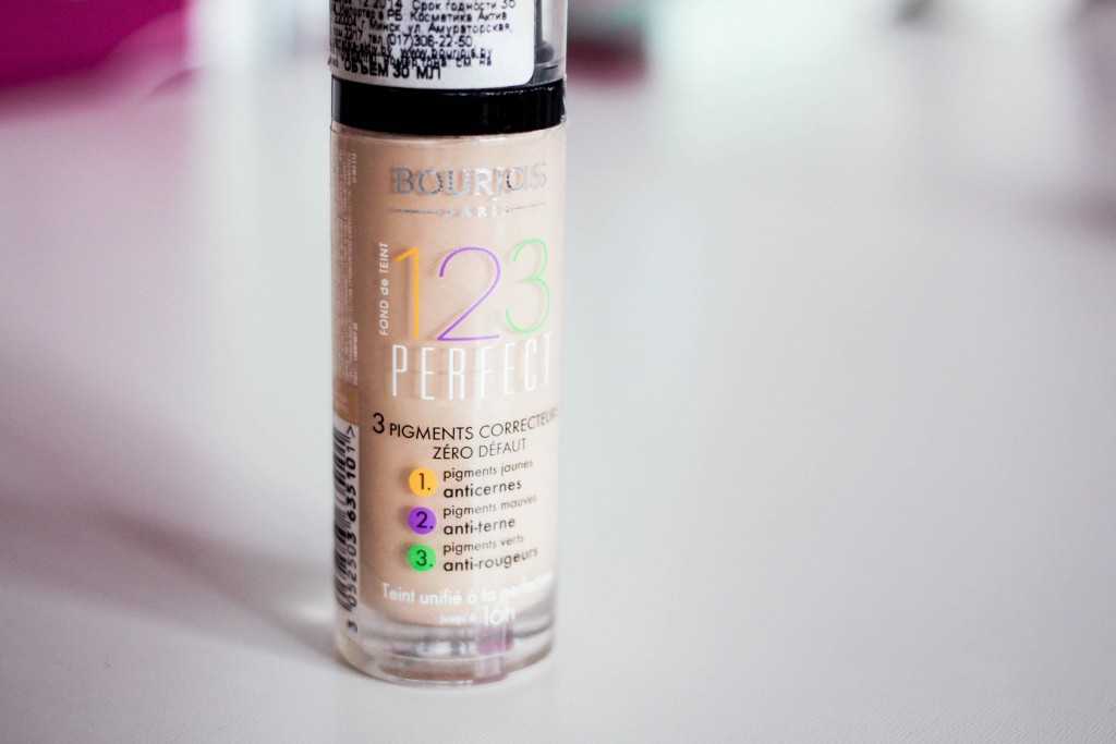 Второе отлично зарекомендовавшее себя средство из моего личного топа — тональный крем от Bourjois «123 Perfect». Его одобрили даже мои знакомые визажисты. Матирует и разглаживает тон просто отлично! Подходит даже для выравнивания кожи на камеру. При этом нет ощущения маски на лице. Главная особенность этого средства в том, что в нем содержатся 3 активных пигмента, заглушающих ненужные оттенки: гасящий красные воспаления зеленый, маскирующий синие сосуды желтый и убирающий тусклую желтизну фиолетовый. И что удивительно — это правда работает!