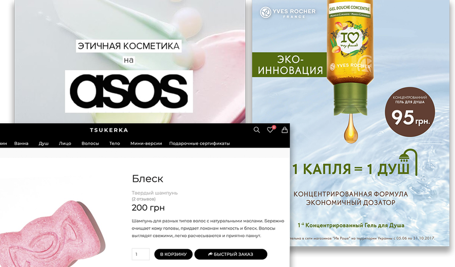 Французский бренд Yves Rocher, представленный как физическими, так и онлайн-магазинами, в 2017 году представил в Украине чудо рационального потребления – гель для душа, расходуемый по одной капле. Среди других анти-консьюмеристских веяний: косметика и бытовая химия, не тестируемые на животных, твердый шампунь (его использование считается экономичным, а концепт позволяет избежать использования пластика, что полностью отвечает принципам идеологии zero-waste). Ниша косметики в целом является одной из самых располагающих к применению концепции рационального потребления.
