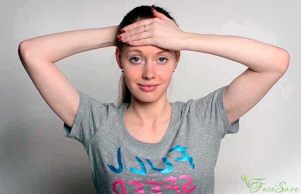 Скрещиваем пальцы между собой и ставим ладони на всю поверхность лба, начиная от бровей. Плотно фиксируем ладони ко лбу, а брови в этот момент поднимаем наверх, оказывая сопротивление.