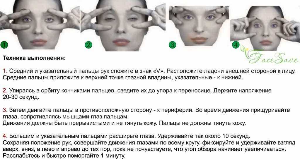 2. Из указательных и больших пальцев рук образуйте полукруги, фигура должна напоминать очки. Указательные пальцы расположите на области чуть ниже бровей, а большие – на скулах. Слегка надавите и в течение 30 секунд быстро-быстро моргайте.