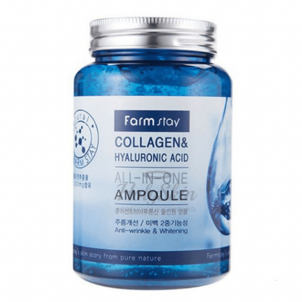 All In One Collagen and Hyaluronic Ampoule включает в себя морской коллаген, гиалуроновую кислоту и другие активные вещества. После применения кожа становится более увлажненной и ухоженной.