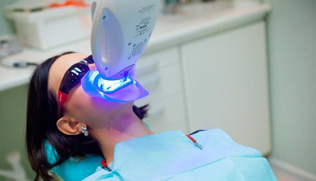 Стоматолог отбеливает зубы с помощью гелей или составов, которые активизируются облучением ультрафиолетом или LED-светом.