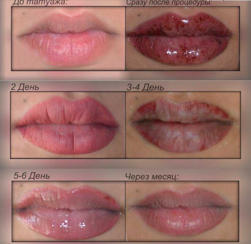 На фото можно посмотреть, как происходит заживление после перманентного макияжа губ по дням: