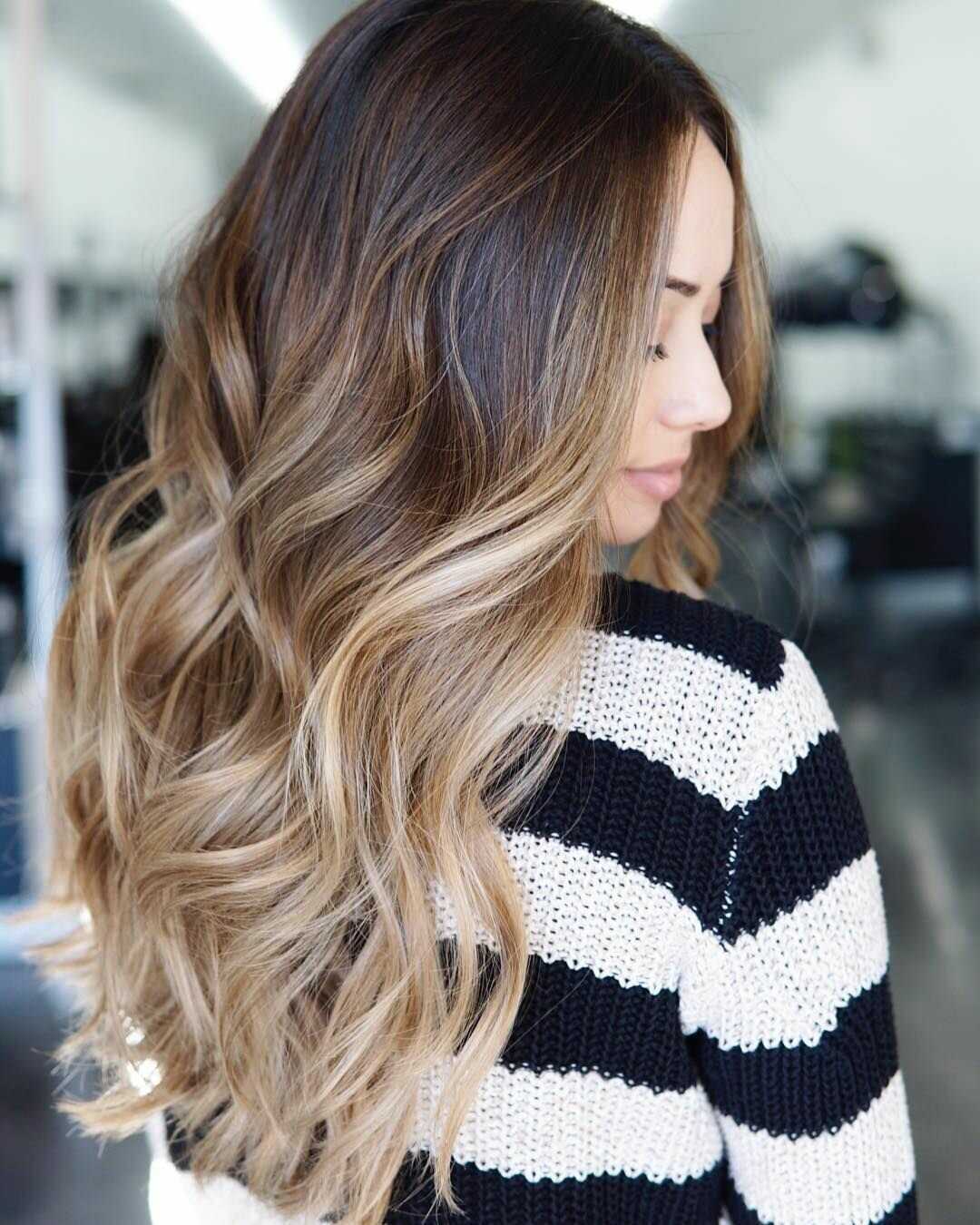 Эта техника отличается плавным переходом от более темного возле корней к блонду ближе к кончикам. Опытный мастер способен соединить в прическе до десятка тонов. Популярностью пользуется натуральная тепла цветовая гамма, когда коричневый плавно переходить в карамель или мед.