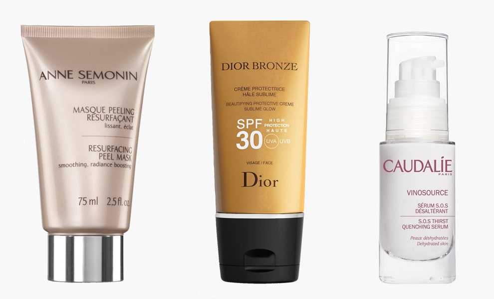 Anne Semonin, Resurfacing Peel Mask, 10133 рубля, annesemonin.ru; Dior, Dior Bronze Beautyfing Protective Creme Sublime Glow SPF 30, цена по запросу, бьюти-бутики Dior; Caudalie, Vinosource Le Serum S.O.S Desalterant, 3295 рублей, shop.rivegauche.ru