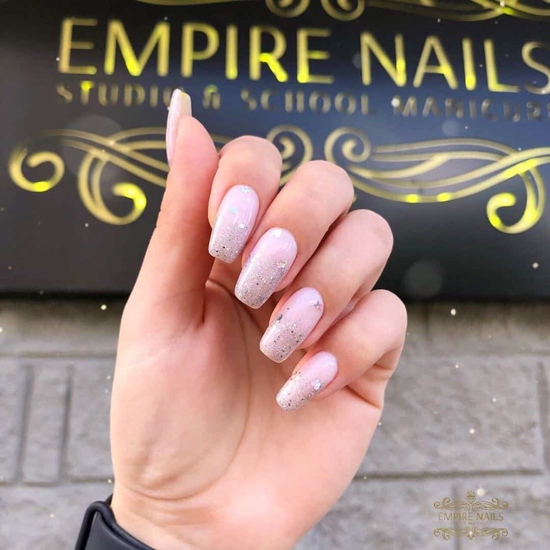 Стоит быть осторожной с глиттером — маникюр на свадьбу невесте с использованием блесток выглядит очень эффектно, но важно гармонично сочетать его с платьем. Если у твоего наряда теплый подтон — выбирай золотой глиттер, если холодный — серебряный