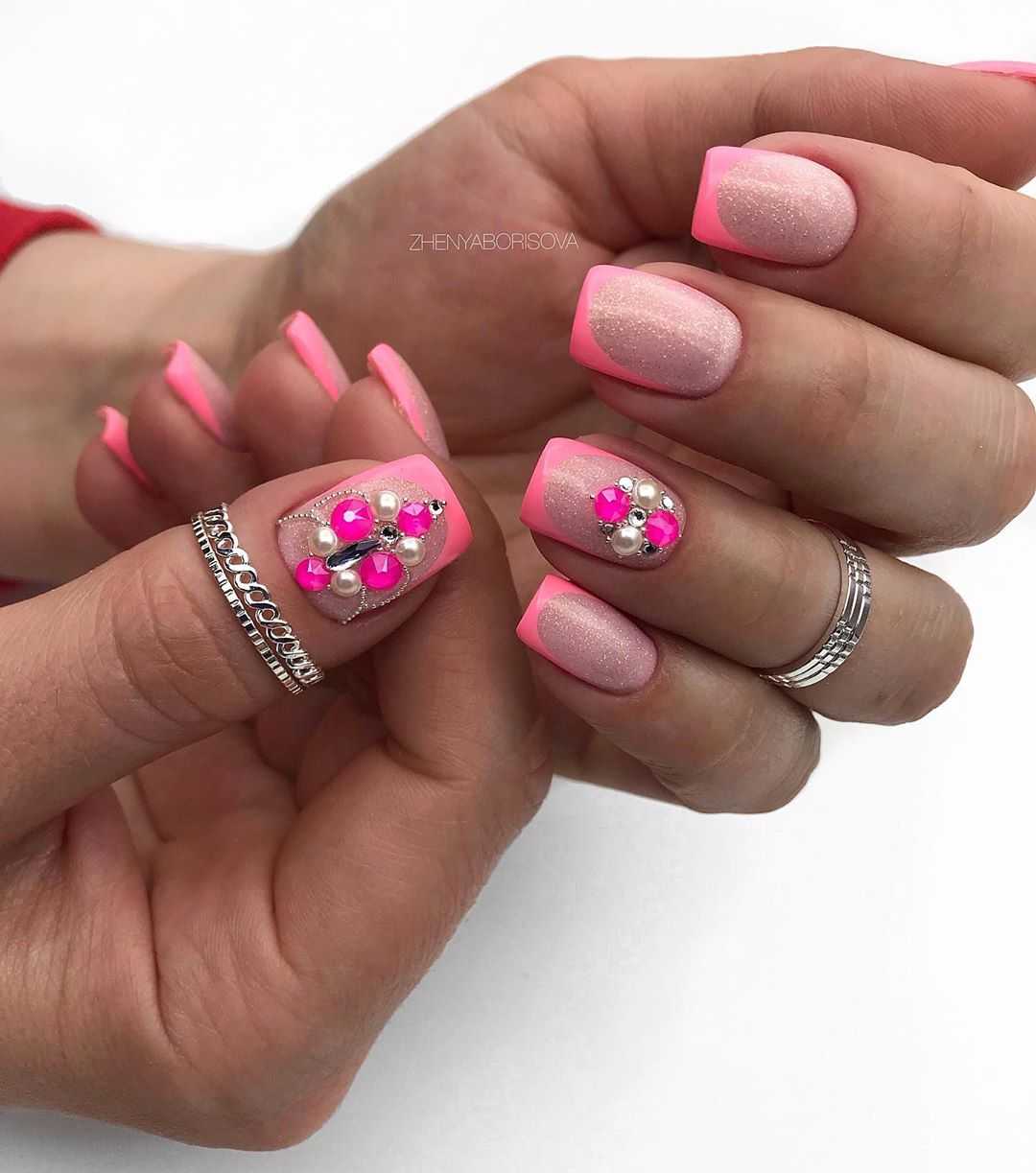 - Стразы . Если ваш наряд расшит камнями или жемчужинами, обязательно используйте для декора ногтей стразы. Не стоит клеить камни на всю поверхность ногтя. Достаточно выложить область лунулы или по линии начала свободного края. Выбирайте качественные камни Сваровски, которые при попадании солнечных лучей красиво переливаются.