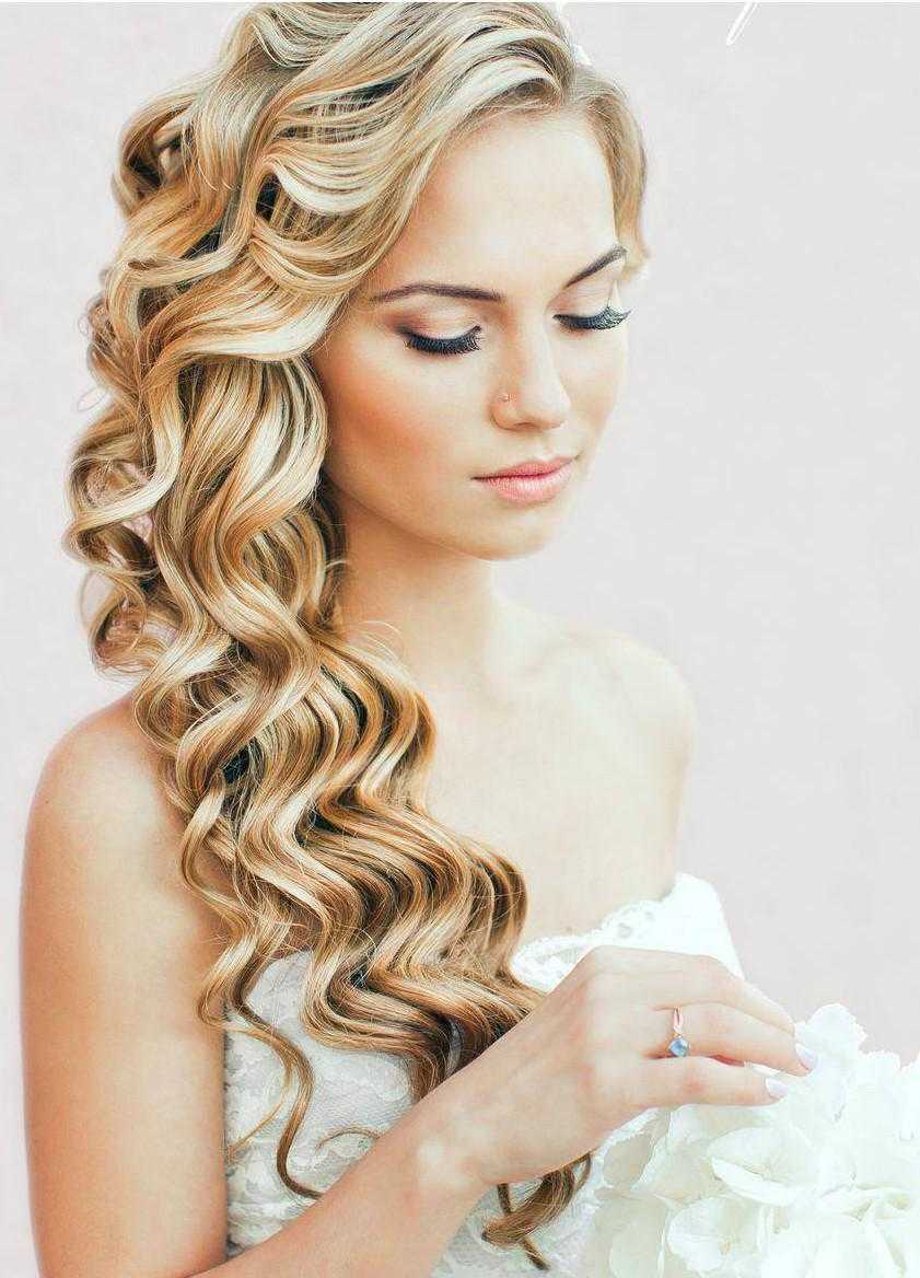 Свадебная прическа с длинными распущенными волосами на бок