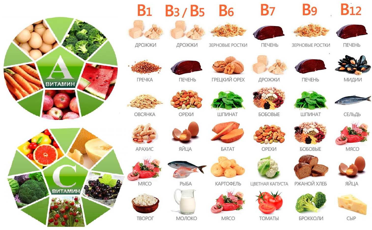 Продукты, содержащие витамин А: печень, черемша, брокколи, калина, чеснок, угорь, масло сливочное, сыр плавленый, сметана, брынза, морская капуста, водоросли, устрицы, творог. Продукты расположены от самого насыщенного витамином к менее насыщенному соответственно. Также есть витамин А в моркови, красном перце, рыбьем жире, абрикосах.
