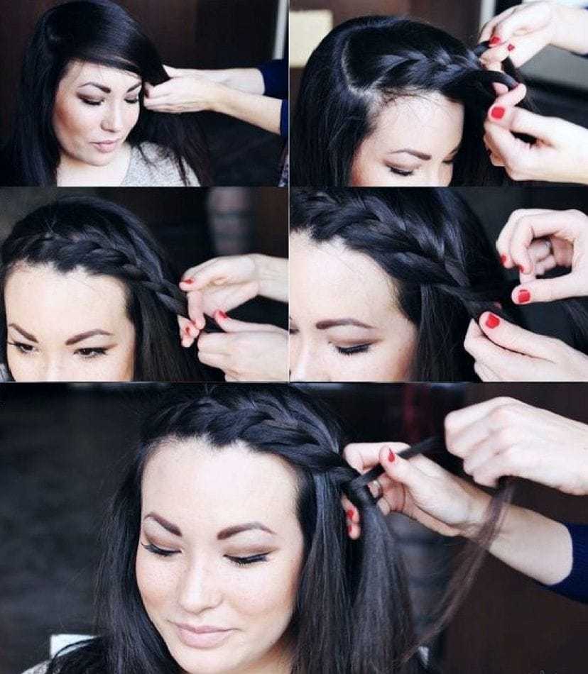 - Косичка-ободок из передних прядей. Такой вариант подойдет для обладательниц коротких челок. Заплетите волосы из челки в небольшую косичку и закрепите ее кончик под основной массой волос сбоку
