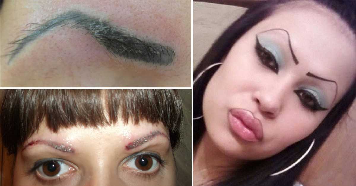 Непрофессиональное выполнение татуажа бровей: ошибки в цвете, неровные линии, асимметричность.