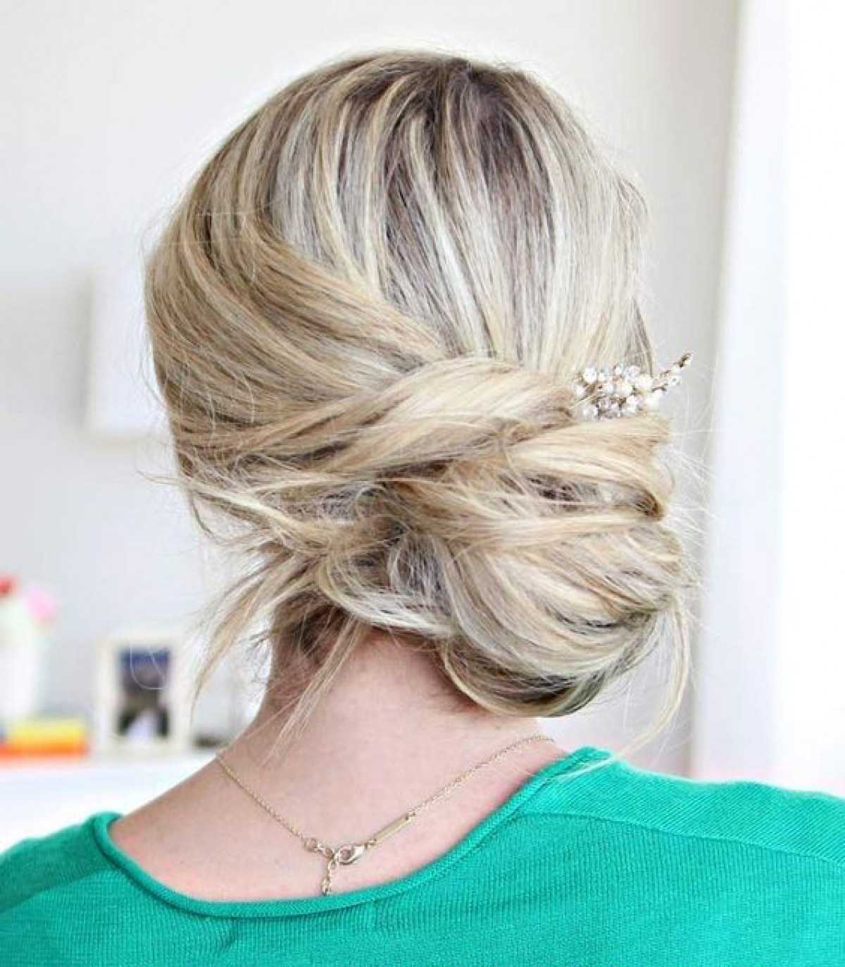 Если в ваших планах присутствует торжественное мероприятие, вы легко можете сделать своими руками небрежный пучок на средние волосы. Для этого необходимы немного времени и красивая декоративная заколка. Правильно подобранный аксессуар дополнит ваш образ и сделает его стильным и эффектным. В качестве декоративных элементов можно использовать стразы, бусины, разноцветные камни, жемчуг, цветы и пр. Пошаговая инструкция выглядит так: