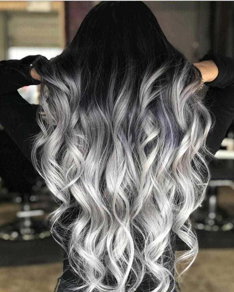 Монохромное омбре — это сочетание холодной платины у корней с радикальным черным. Переход может быть равномерно размытым, или иметь четкую горизонтальную линию. Приверженцы минимализма часто прибегают к таким цветам колорирования светлых волос.