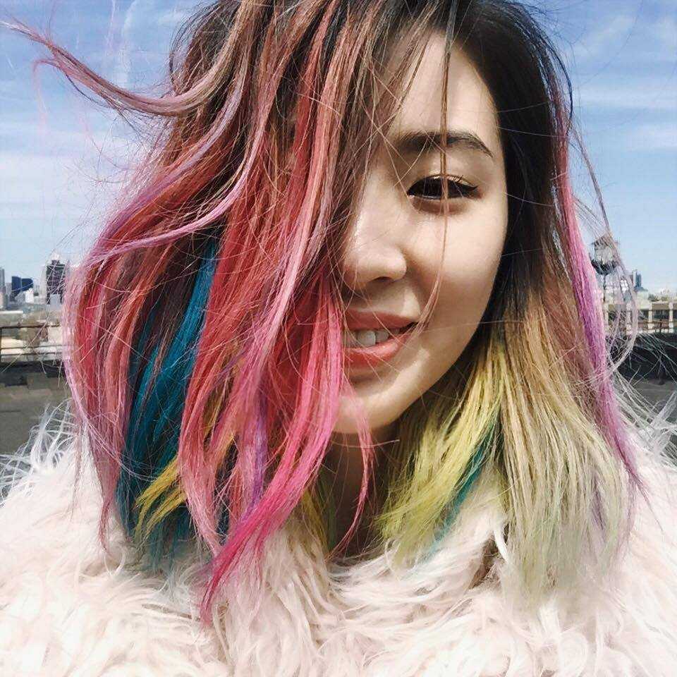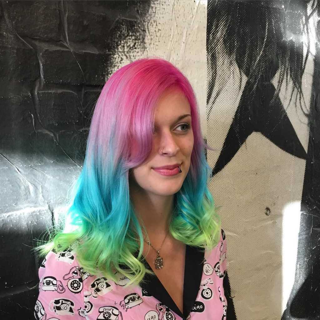 Неоновое окрашивание подходит для смелых эпатажных девушек. На основной темный тон волос наносятся разноцветные краски на отдельные пряди. Сначала они обесцвечиваются, а потом покрываются красящим гелем ярких цветов. Чтобы иметь возможность сменить имидж, используются нестойкие составы, которые держатся не дольше 30 дней. Затем колорирование можно повторить или сменить цвет. Гамма цветов может варьироваться от сине–голубых до розово–сиреневых оттенков.