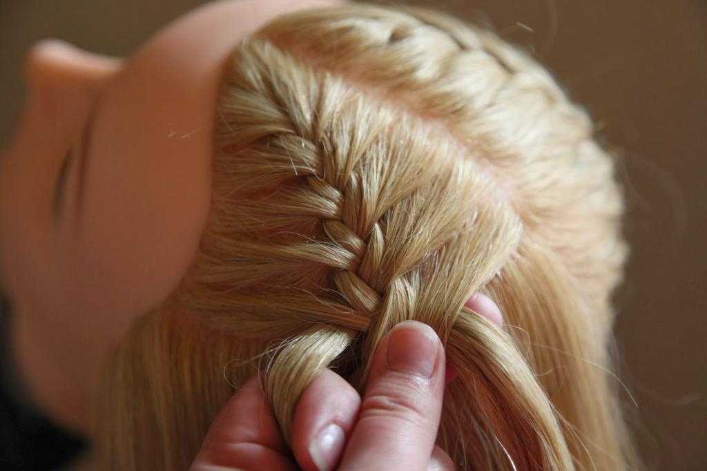 - Далее перекиньте переднюю прядь через среднюю и включите в первую свободные волосы, находящиеся на одном уровне с данной прядью.