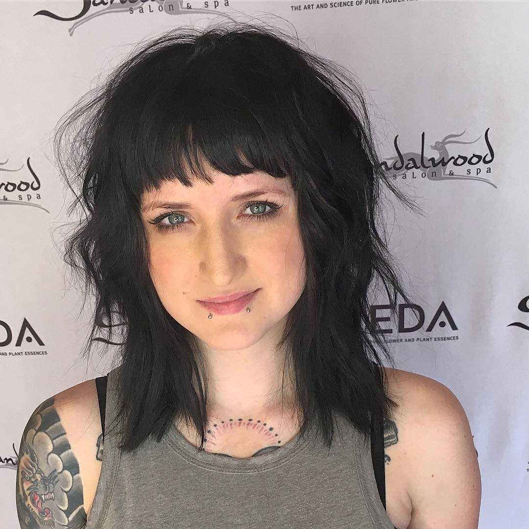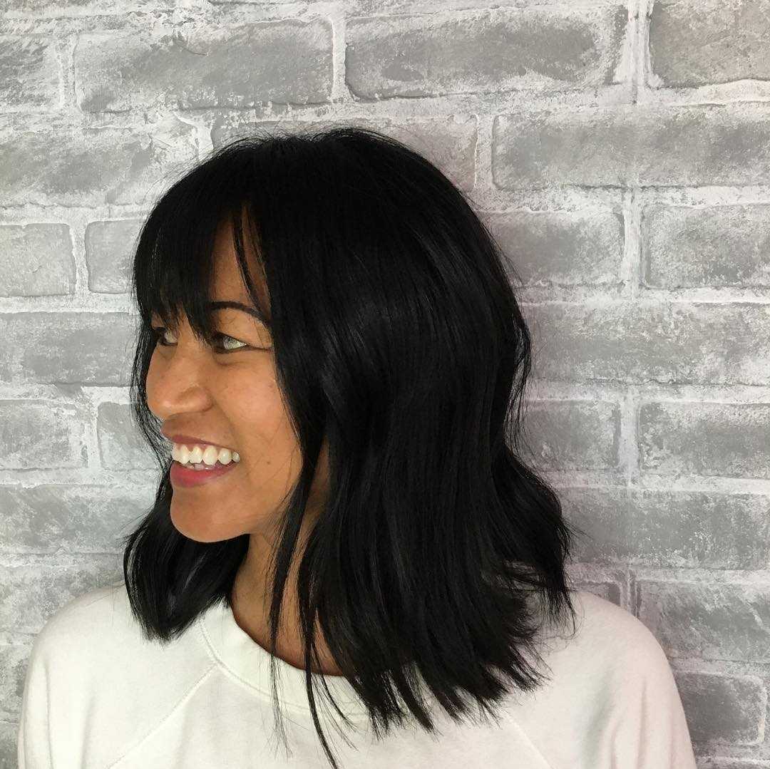 Средние многослойные волосы — один из тех отличных универсальных стилей. Для густых волос косой каре придает объем и легкую укладку. Для тонких волос он создает иллюзию густых волос. Растушуйте крем для завивки волос и добавьте бликов, чтобы сделать тон кожи ярче.