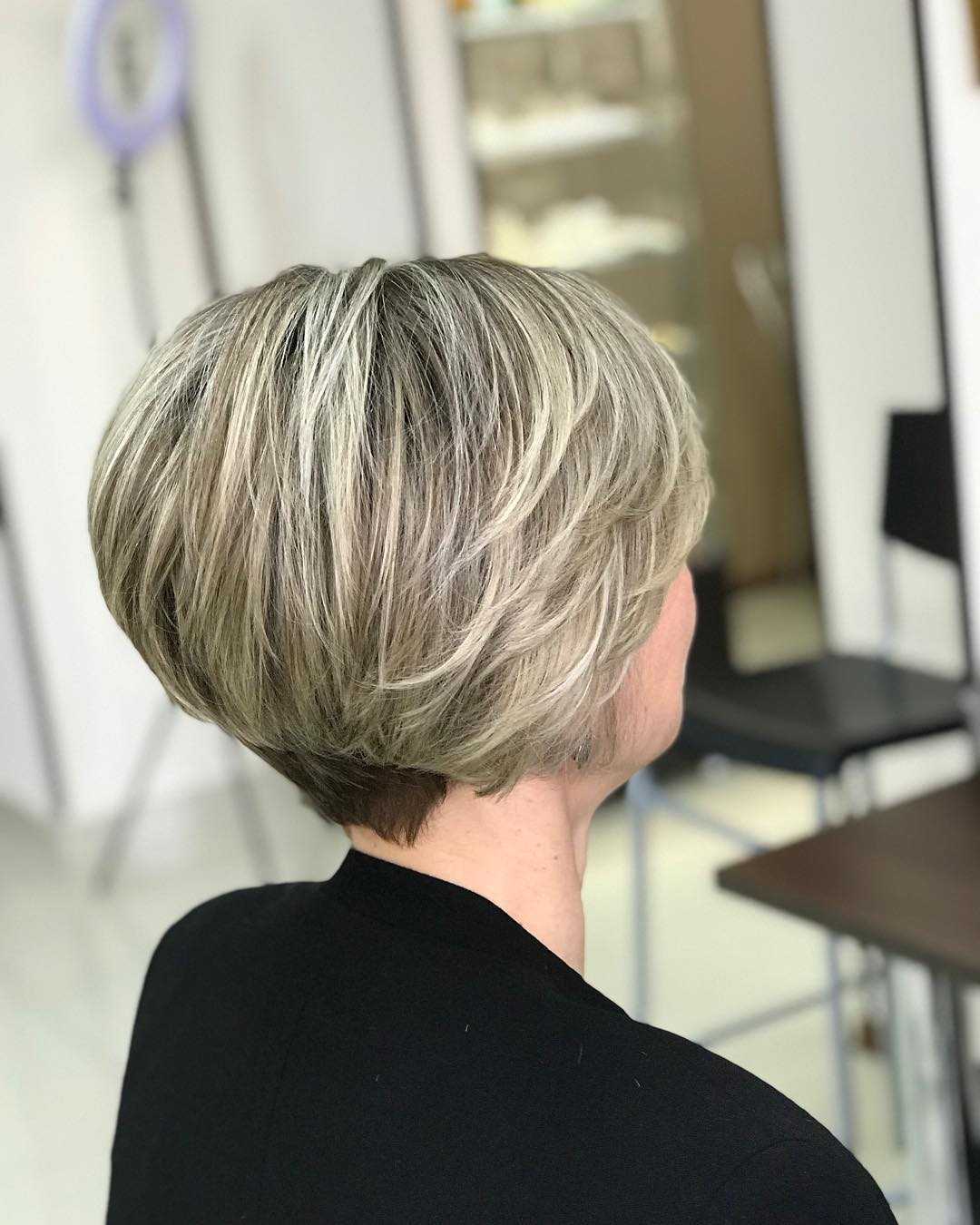 Техника прически заключается в послойном состригании слоев: каждый последующий слой делается на несколько миллиметров короче предыдущего. На макушке пряди будут короткими, а на затылке длинными.