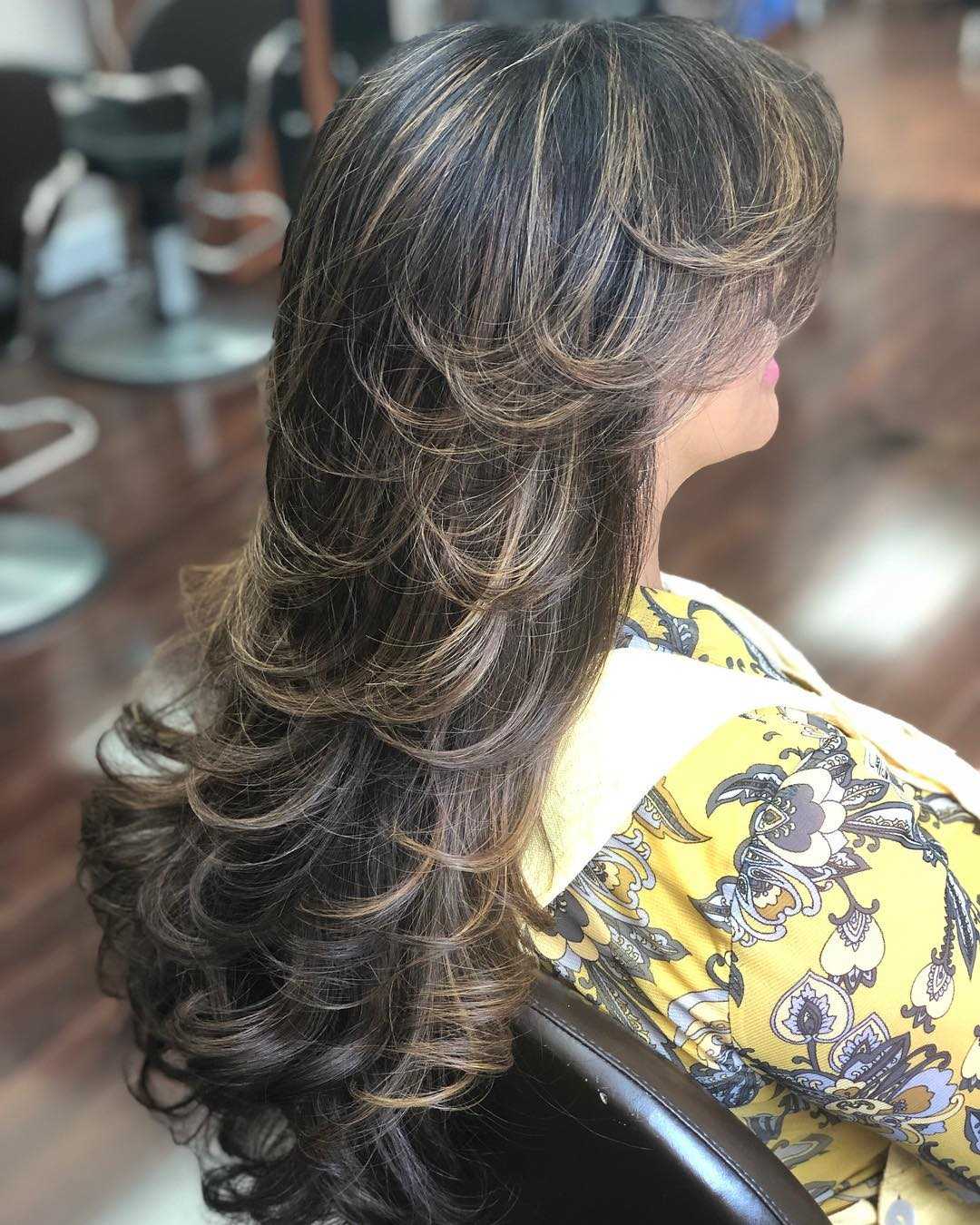 Длинные волосы ― отличная основа для популярной лесенки. Такая длина позволяет индивидуально выстраивать каскадный рисунок, создавая объемные контуры. Модницы в этом году предпочли многоуровневый переход, который оформляется сзади и лишь слегка затрагивает передние прядки. Особенно шикарно смотрится лесенка, если выполнить ее в виде «перышек».