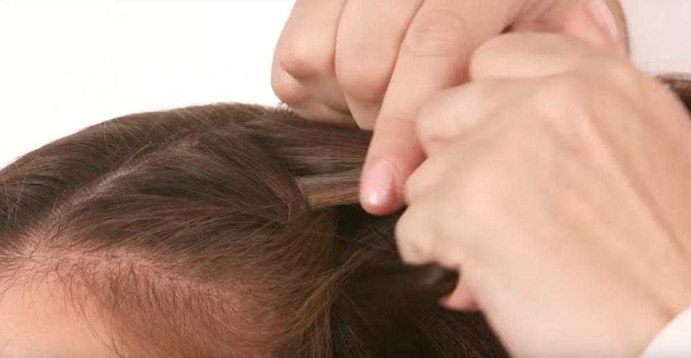 - Выделить прядь волос примерно на затылке, разделить на 3 части.